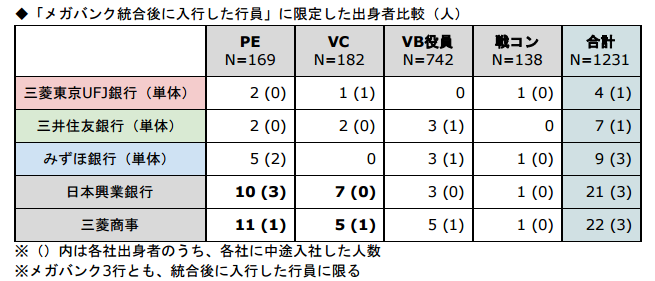上記の表からは、旧・日本興業銀行、三菱商事が多数のPE・VCファンドメンバーを輩出しているのに対し、メガバンク3行の出身者はいずれも数名にとどまっていることが読み取れます。