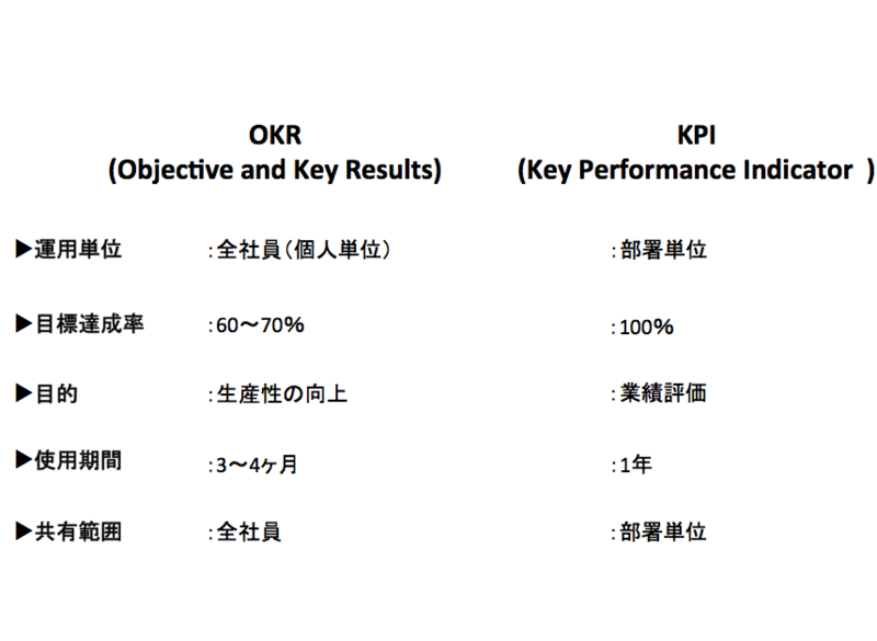 また、目標を共有する範囲もOKRのほうが広く設定されており、どの社員が何をやっているかがわかるようになっています。これは、誰が何をやっているか分かるようにすることで、部署ごとの透明性を高めると同時に、「あいつ何もやってないじゃん」のような負の雰囲気の抑制にも繋がります。