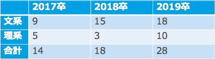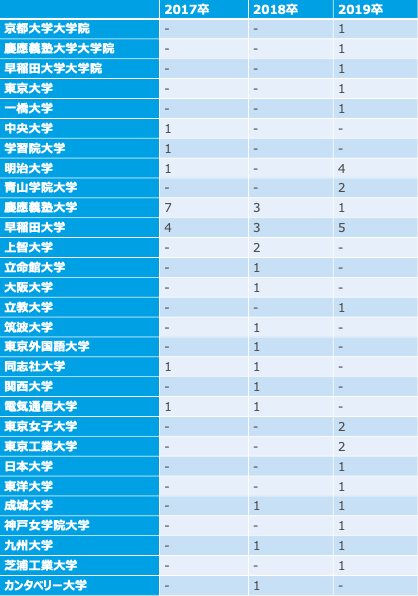 偏差値上位校の採用人数は多いですが、幅広い大学から採用しています。また、採用人数が2017年度から2019年度にかけて増加していることが分かります。