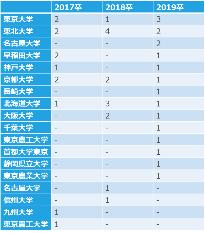 東京大学大学院、東北大学大学院、名古屋大学大学院、早稲田大学大学院、神戸大学大学院、京都大学大学院、長崎大学大学院、北海道大学大学院、大阪大学大学院、千葉大学大学院、東京農工大学大学院、首都大学東京大学院、静岡県立大学大学院、信州大学大学院、九州大学大学院
