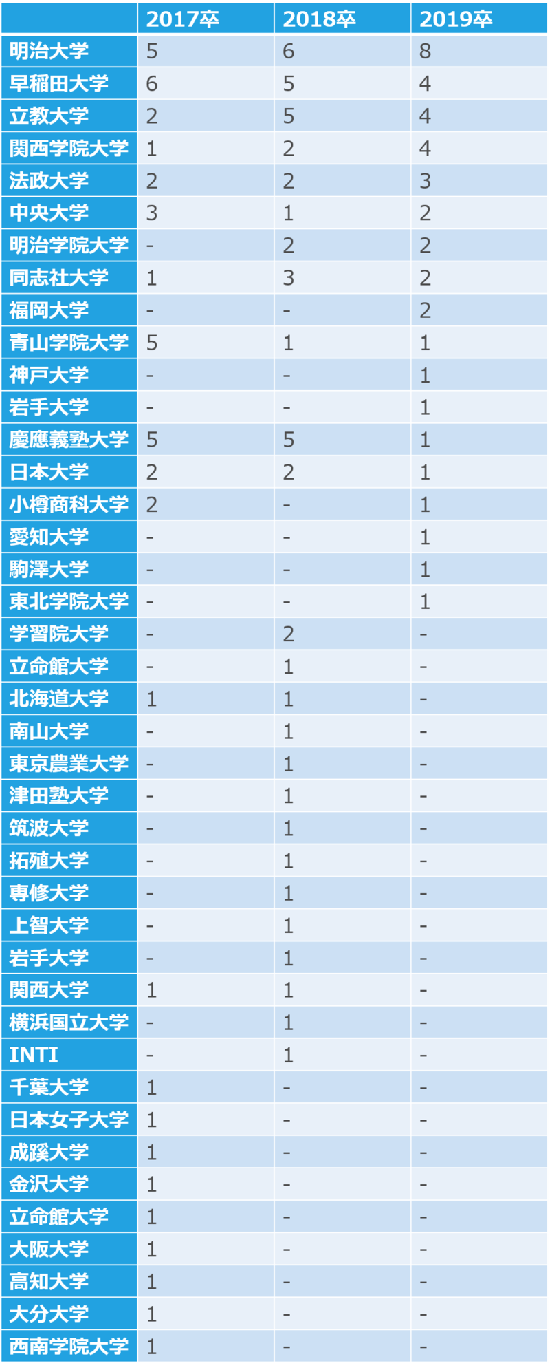 明治大学、早稲田大学、立教大学、関西学院大学、法政大学、中央大学、明治学院大学、同志社大学、福岡大学、青山学院大学、神戸大学、岩手大学、慶應義塾大学、日本大学、小樽商科大学、愛知大学、駒澤大学、東北学院大学、東京農業大学、学習院大学、立命館大学、北海道大学、南山大学、東京農業大学、津田塾大学、筑波大学、拓殖大学、専修大学、上智大学、関西大学、横浜国立大学、INTIインターナショナル大学、千葉大学、日本女子大学、成蹊大学、金沢大学、大阪大学、高知大学、大分大学、西南学院大学