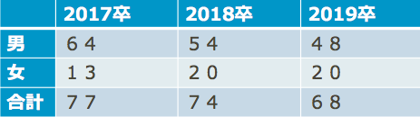 北陸電力の過去3年分の男女別採用人数(※大卒および修士のみ)は次のようになっています。