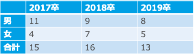 朝日放送の過去3年分の男女別採用人数(※大卒および修士のみ)は次のようになっています。