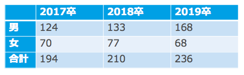 TISの過去3年間の男女別採用人数は以下のようになっています。