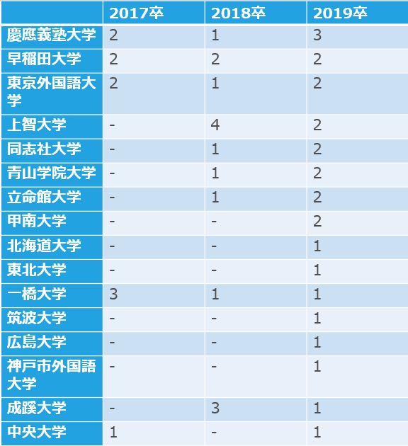 東京大学、名古屋大学、九州大学、大阪市立大学、滋賀大学、長崎大学、横浜国立大学、大阪大学、京都大学、神戸大学、群馬大学、横浜市立大学、京都市立大学、東京外国語大学、北海道大学、東北大学、一橋大学、筑波大学、広島大学、神戸市外国語大学、慶應義塾大学、早稲田大学、上智大学、同志社大学、青山学院大学、立命館大学、甲南大学、成蹊大学、中央大学、法政大学、明治大学、立教大学、関西学院大学