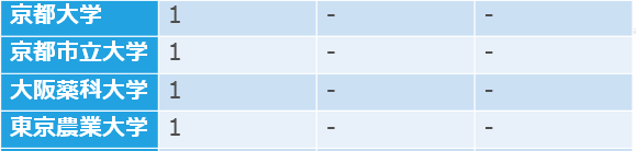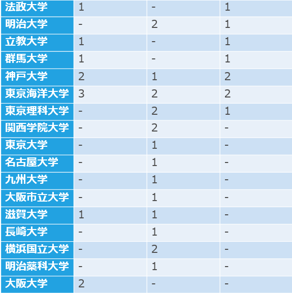 東京海洋大学、神戸大学、早稲田大学、大阪薬科大学、東京農業大学、早稲田大学、東京理科大学、宇都宮大学、広島大学、鹿児島大学、群馬大学、横浜国立大学、明治薬科大学、成蹊大学