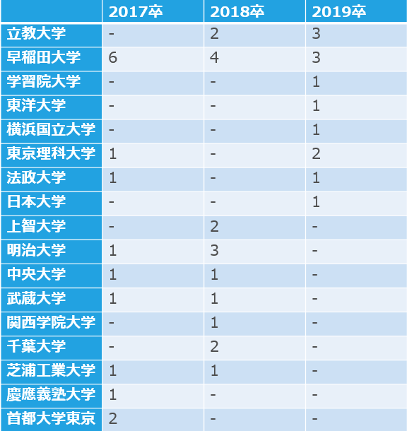 早稲田大学、立教大学、上智大学、明治大学、中央大学、武蔵大学、関西学院大学、千葉大学、学習院大学、東洋大学、慶應義塾大学