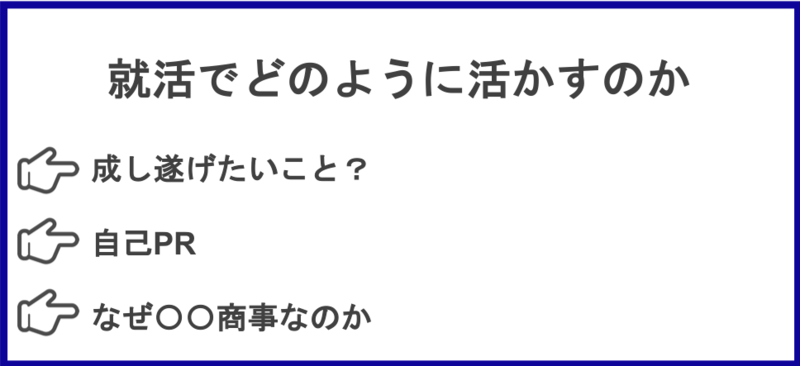 ここから、就活生のみなさんは総合商社で成し遂げたいことについて考えることができます。