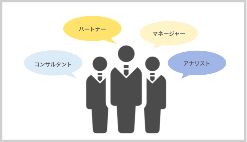 コンサルティングファームで働く社員は、「コンサルタント」と総称されますが、経験年数や期待される役割に応じていくつかの役職が存在します。その役職の呼称は各企業によって様々ですが、ここでは、外資コンサルの給与目安を役職別に紹介します。