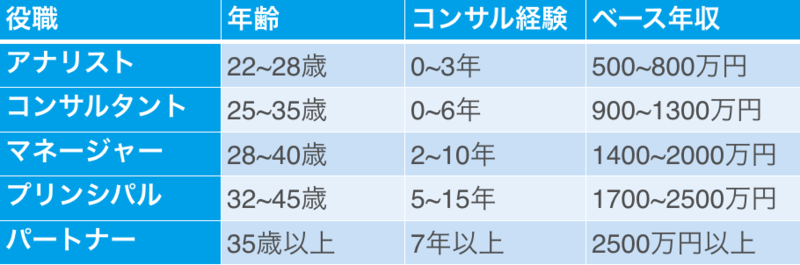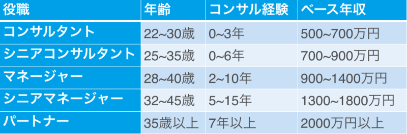 合わせて、各役職では、コンサルの経験が何年ぐらい必要で、何歳ぐらいのコンサルタントが該当するのかという点もご紹介します。