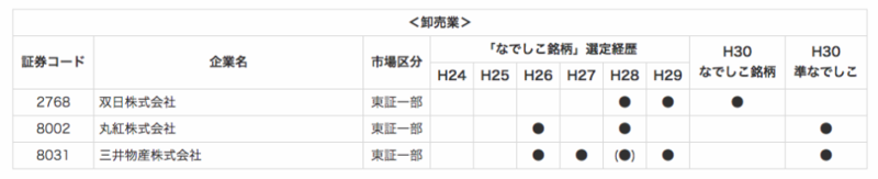 七大総合商社では、双日がなでしこ銘柄に選定、丸紅、三井物産が準なでしこ銘柄に選定されています。