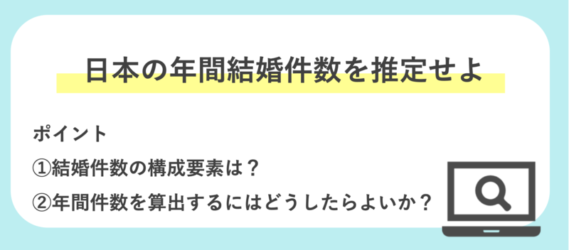 過去BCGのケース面接で出題された、「日本の年間結婚件数を推定せよ」をフェルミ推定を使って求めていきたいと思います。