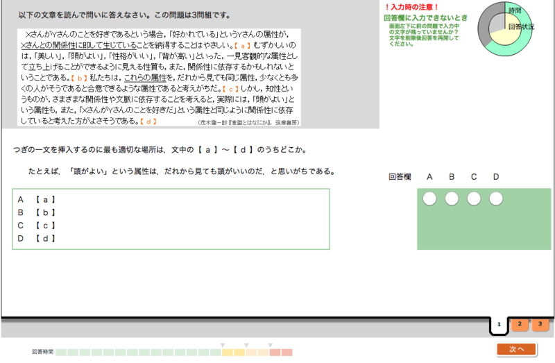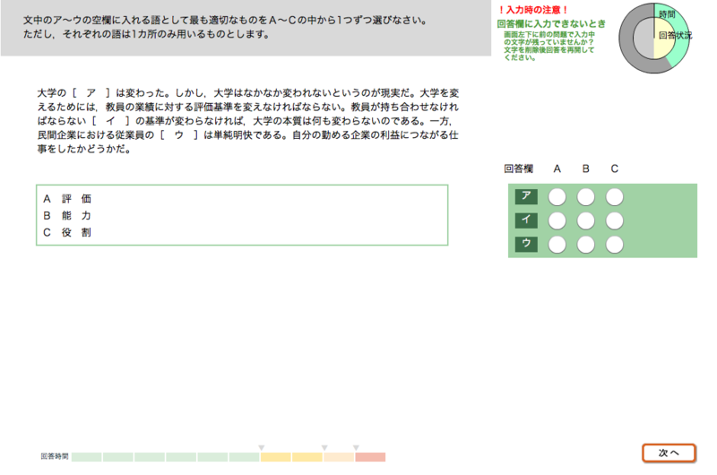 150〜200字程度の長さの文章に3カ所穴が空いており、それぞれに適切な語句を補充するというもの。短めの文章なのでまずは落ち着いて読むこと。