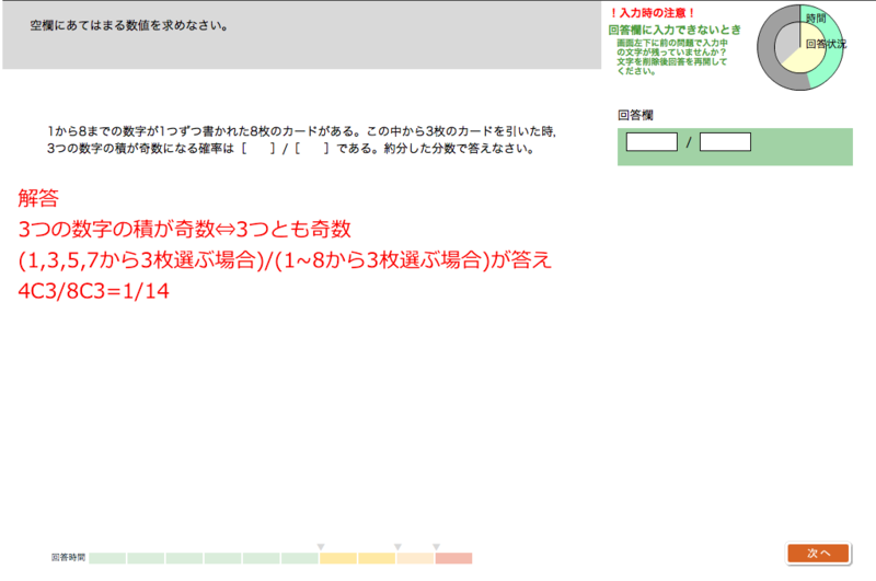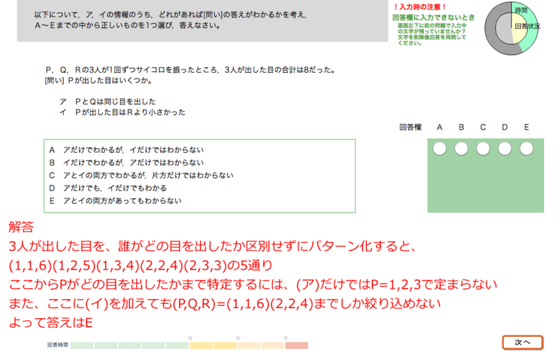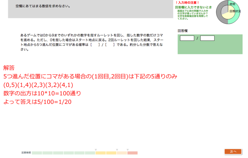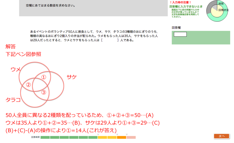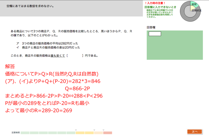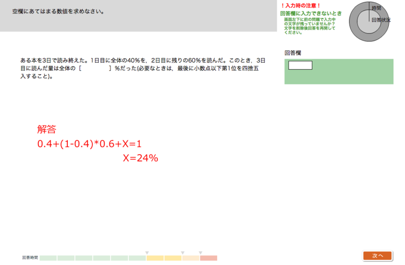 10秒足らずで解けるような簡単なものも多い一方で、複数回の式変形を要する骨の折れるものも。一度問題を飛ばすともう戻って解答することは出来ないが、あまりに時間を取られるようであればスキップするのも手。