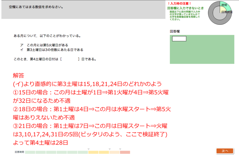 今回はカレンダーの規則性に関する出題があった。「+7日で翌週同曜日」「ー7日で前週同曜日」という当たり前のことから導けるが、面食らってしまうと時間を取られるかもしれないので慣れておきたい。