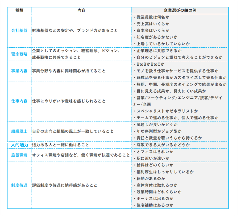 その他に関しては、下図にあるような自己分析から得た、企業選びの軸をもとに、年収やキャリア、一緒に働く人などについて、様々な角度から情報収集を行ってみてください。