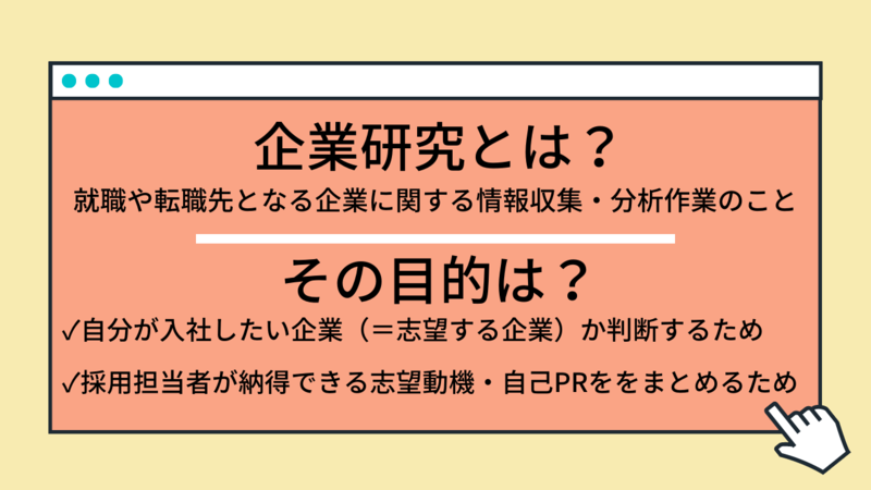 なぜ企業研究を行う必要があるのかというと、「自分が入社したい企業(=志望する企業)であるかを判断するため」・「採用担当者が納得する志望動機・自己PRを作成するため」という2つの目的があるためです。