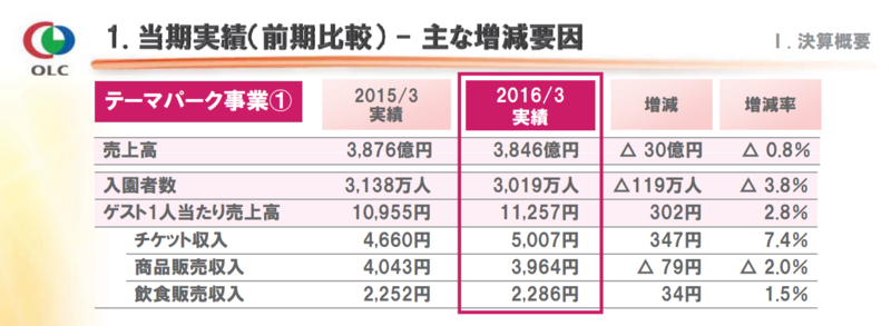 ディズニーランドによく行く人はご存知かもしれませんが、2015年4月1日にチケットの値上げをしており、値上げがダイレクトにチケット収入の増加( 4,660円→5,007円)につながっています。ディズニーランドは段階的に値段の引上げを行っており、2016年4月1日にも3年連続となる値上げを行っています。